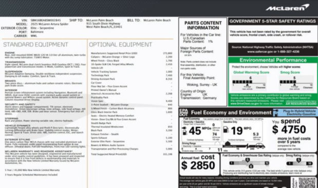 This 2025 McLaren Artura Spider is featured in Serpentine Green with Dove Gray/Black interior. Options include: McLaren Orange Calipers with Silver Logo, 10 Spoke Super Lightweight Gloss Black Forged Alloy Wheels, VEHICLE LIFT, Vehicle Tracking System, Technology Pack, Driving Assistant Pack, America's Accessories Pack, Vision Spec, 3 Point McLaren Orange Seatbelt, Carbon Black Alcantara Steering Wheel Finish, Thermal Insulated Windscreen, Black Pack Sports Exhaust w/ Stealth Black Finisher and Elite Serpentine Green Exterior Paint Color. McLaren Palm Beach- South Florida's Authorized McLaren retailer. Visit McLarenPalmBeach.com 24/7 for our complete new and pre-owned luxury listings. https://www.mclarenpalmbeach.com/new-vehicles/new-vehicle-specials/