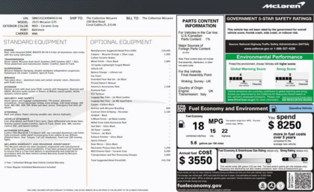 This 2025 McLaren GTS TechLux is featured in MSO Ceramic Grey with Jet Black interior. Options include: McLaren Orange Calipers w/ Silver Logo, VEHICLE LIFT, 10 Spoke Lightweight Forged Gloss Black Alloy Wheels, America's Accessories Pack, Armrest with McLaren Branding, Porcelain Contrast Stitch and Piping, Sports Exhaust with Gloss Black Finisher, Panoramic Privacy Glass Roof and MSO Ceramic Gray Exterior Paint Color. Passed the McLaren Qualified inspection process with extended warranty options available. **Only an authorized McLaren dealer can offer this exclusive benefit.** McLaren Palm Beach- South Florida's Authorized McLaren retailer. Visit McLarenPalmBeach.com 24/7 for our complete new and pre-owned luxury listings.